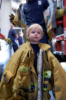 So Matt and I were feeling bad that we didn't have anything planned for Ben's birthday. We had parties 3 weekends in a row. Ben's birthday was on a Thursday & Matt was going out of town on Friday (so no party that weekend). So we decided to call up the fire dept. and ask if we could come by. They said, no problem, we'd love it, you don't have to call, come on over. We hear sirens on our way over, so we know at least one truck will be out. The chief was there and showed us all around the brand new, state of the art firehouse. Ben was in heaven, climbing on the trucks, trying to turn them on. Then, the guys get back from their call with the big hook & ladder. The chief says, "do you guys want to go for a ride?" Uh, yeah!! So we all get in and get headsets (except Ben because he refused to take off the big fire helmet). Did you hear the part about headsets?!? Like REAL headsets where we could talk to the guy driving the back in the Kramer seat. (THE BACK!!!! There's a steering wheel back there because this truck is sooooo big you have to steer the caboose!!!! Call me Cosmo cause I want to drive that thing!!) Lily was into the headset. "Can you hear me now? Now? Mommy! Can you hear me now?" (Guy steering the back says, "I can hear you, Lily!") We take off, drive around the block and then onto Westchester Parkway (FAST!), sirens blaring, all of us yelling, "happy birthday Ben!" We head back and they show off how they can make hairpin turns in that big rig. We got back and the kids played with ladders and oxygen tanks, ya know, really safe stuff. It was so much fun, we all had to lay down at home from all the excitement. We don't feel bad about not throwing Ben a party anymore. Thanks Station 5!!